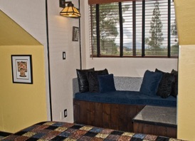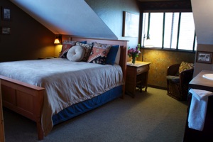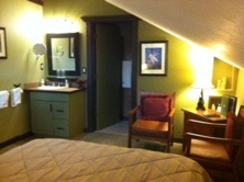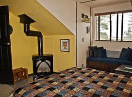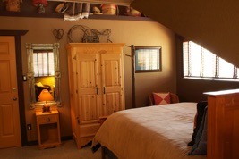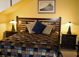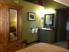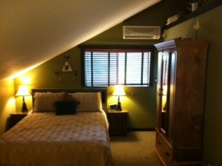 •Queen Bedroom is a bedroom style room with Private Bathroom with shower, and vaulted ceilings on the 2nd floor. No TV in room. TV is in the gathering room.